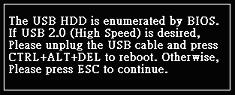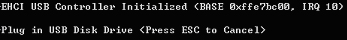 La razón – desde que usted no pone el BIOS “Apoyo de Legado de USB” ni “Teclado de USB” y “Ratón de USB” a “Incapacitado”, el DOS USB 2,0 conductor discierne que el impulsor de discos de USB ha sido controlado por BIOS. Este mensaje indica que si usted quiere utilizar el conductor de disco de USB proporcionado por BIOS (probablemente USB 1,1 velocidad) ejecutar la función de respaldo/restaura. Apriete por favor el botón de ESC directamente, Si usted quiere utilizar DOS USB 2,0 conductor para ejecutar la función de respaldo/restaura, usted tiene que cerrar la computadora primero y quitar el cable de USB y volver a encender la computadora. Cuándo usted ve el mensaje abajo, deberá conectar el cable de USB. |
