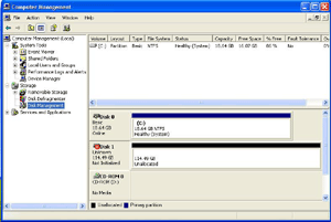 Escoja la administración de la computadora escoge la administración de disco bajo "almacenamiento", para XP un diálogo “inicializa y convierte a mago de disco” debe aparecer automáticamente si se salta para dar un paso 7. |